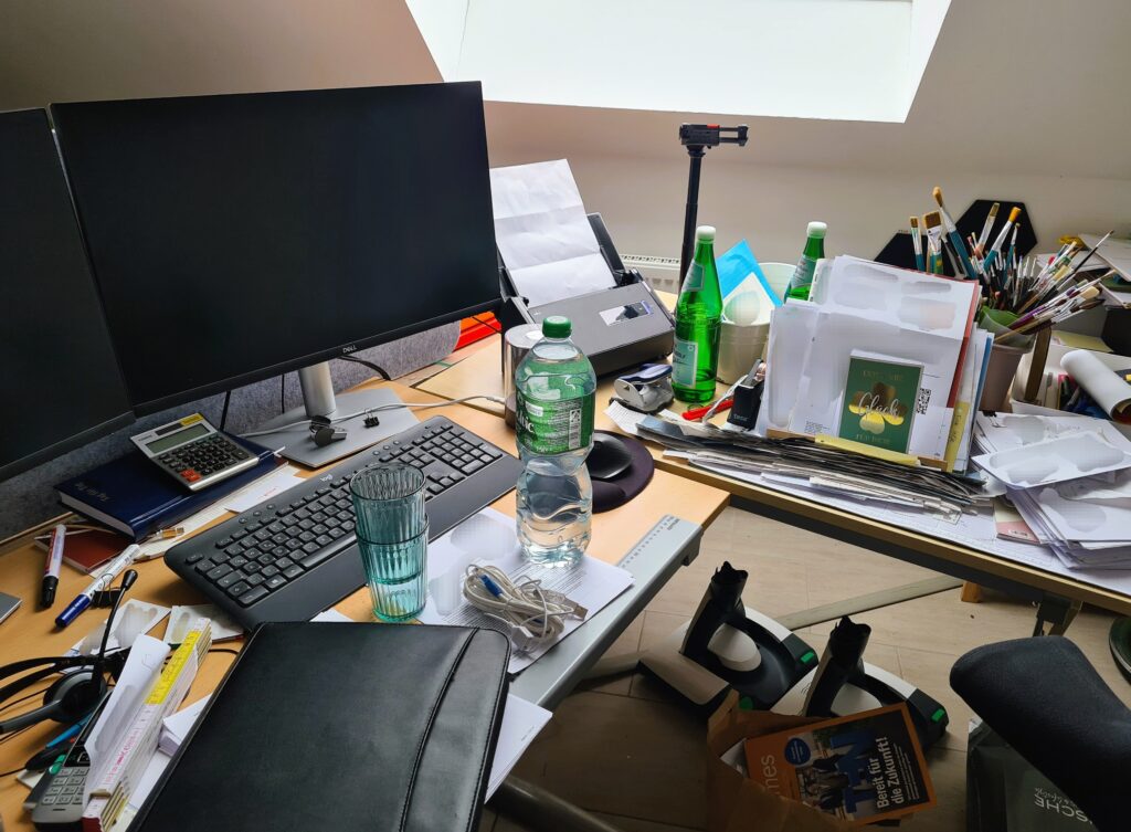 der Schreibtisch als Ablage für alles und jeden genutzt wird und deswegen nie der Untergrund zu sehen ist, weil er übersäht ist mit unnötigem Kram.